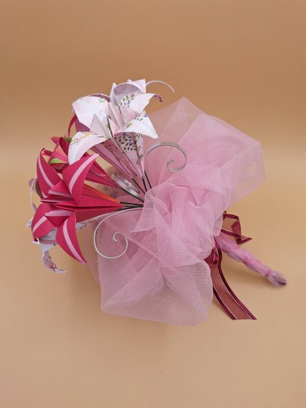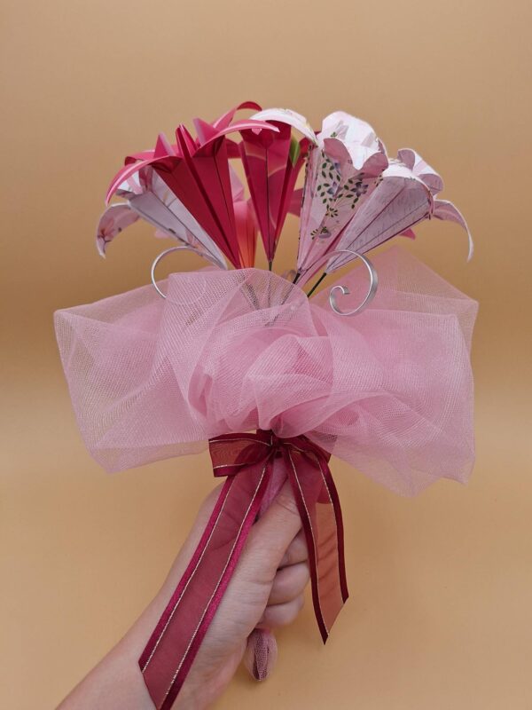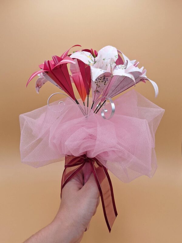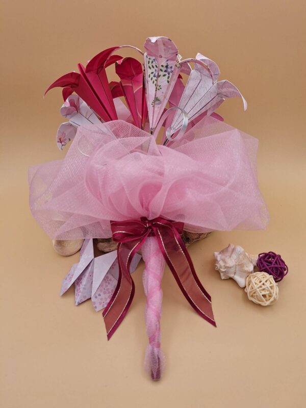 Bouquet de 7 fleurs en origami sur le thème du rose.