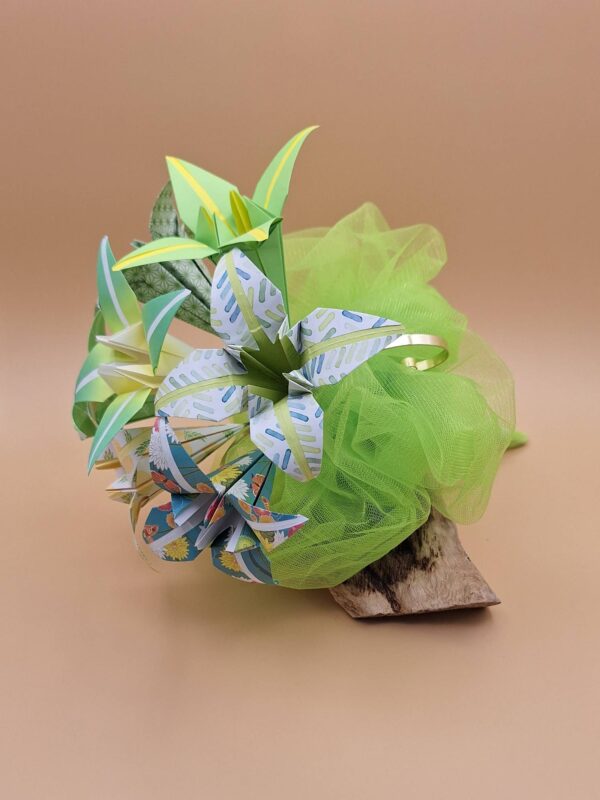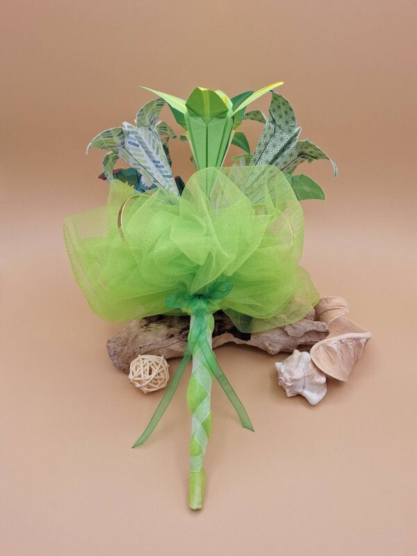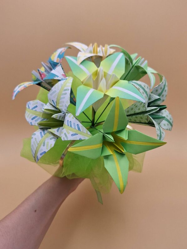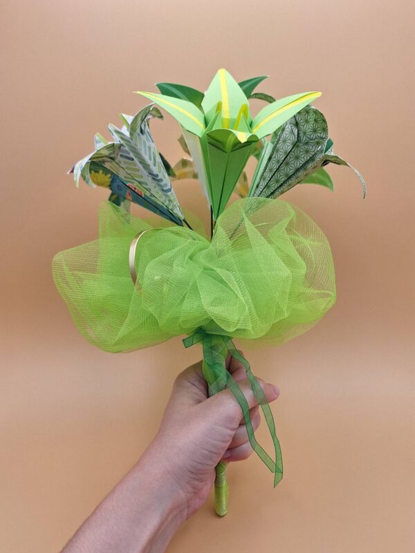 Bouquet de 7 fleurs en origami sur le thème du vert.