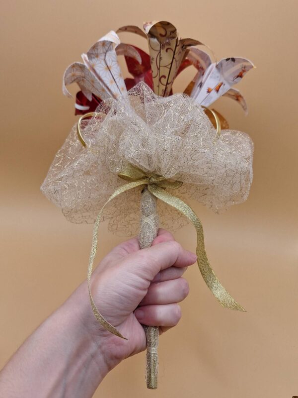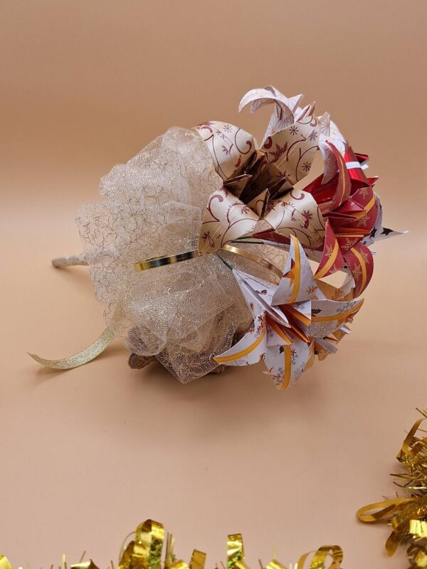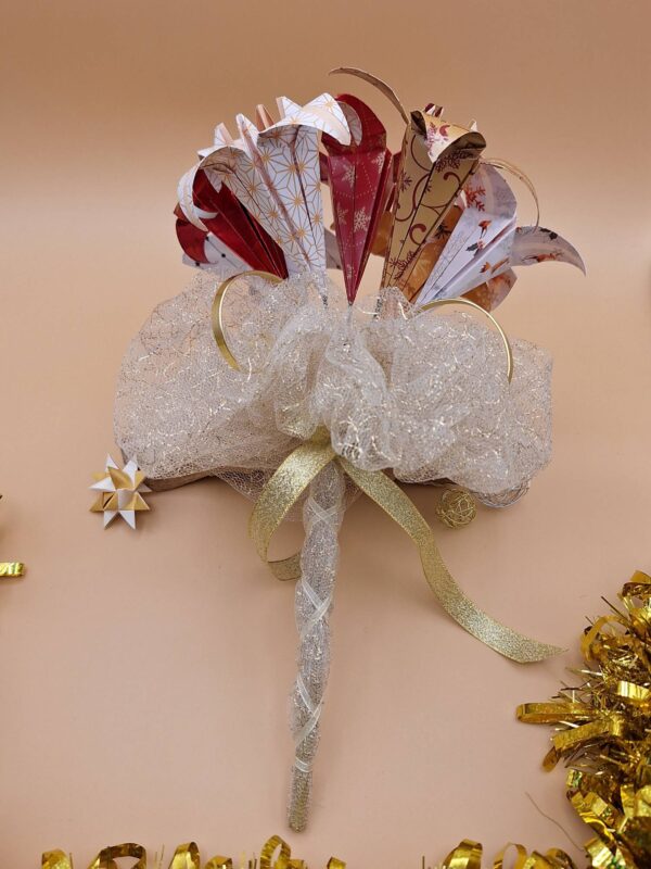 Bouquet de fleur en origami, couleurs rouge et doré.