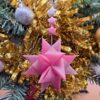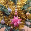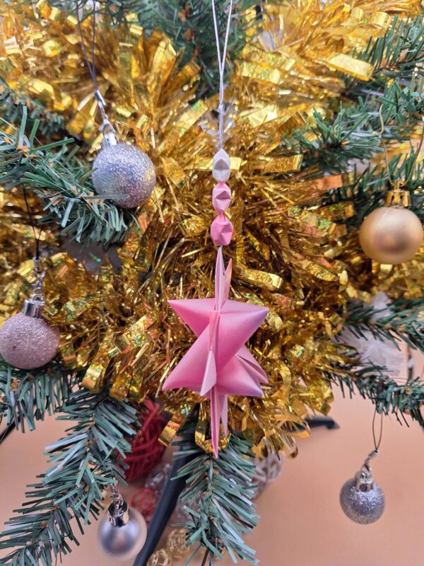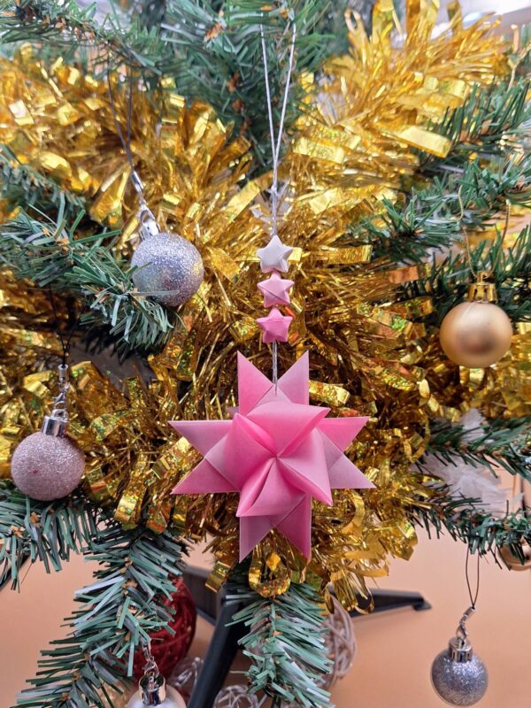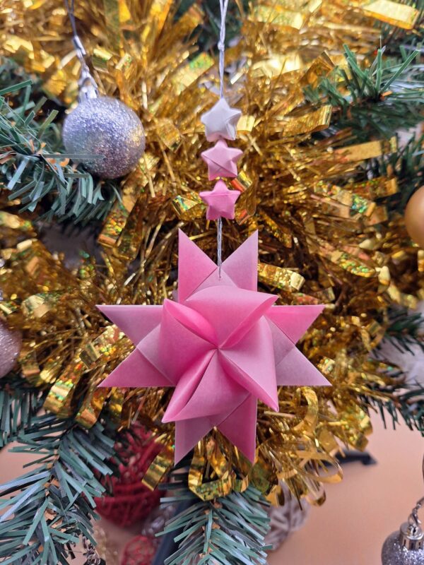 Suspension avec une grande étoile, à papier rose semi-transparent motif dégradé, accompagnée de 3 petites étoiles aux papiers harmonisés.