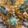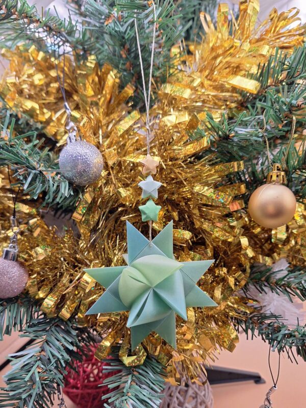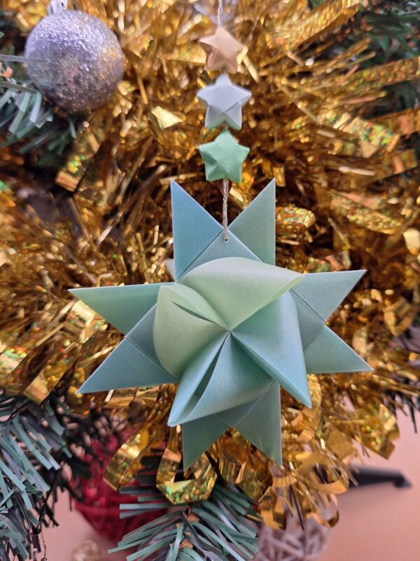 Suspension avec une grande étoile, à papier vert semi-transparent motif dégradé, accompagnée de 3 petites étoiles aux papiers harmonisés.